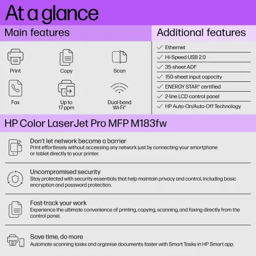 The HP Color LaserJet Pro MFP M183fw is a versatile and efficient multifunction printer designed to meet all your printing needs. With a range of features aimed at enhancing convenience, connectivity, and security, this printer delivers exceptional performance for both home and office use.